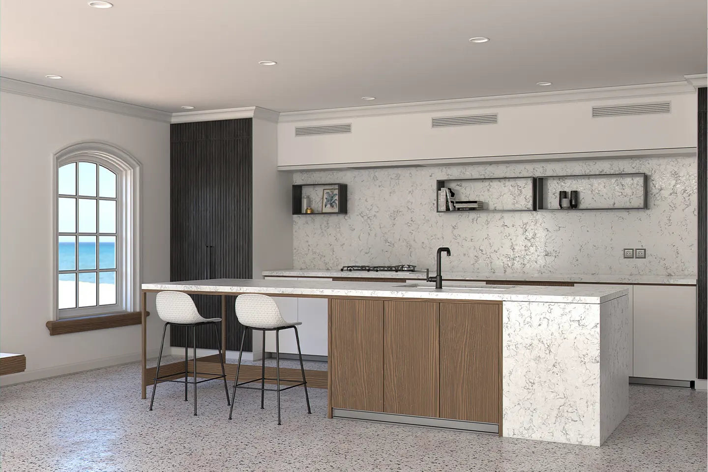 Doğal kuvars minerallerinden üretilir. Pürüzsüz ve gözeneksiz yapısı sayesinde temizliği kolaydır, mutfakta konforlu bir kullanım sunar.