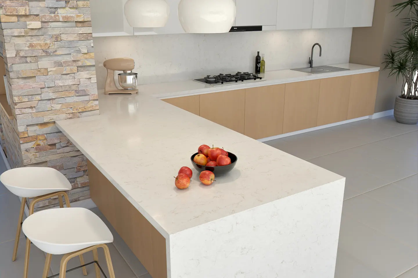 Doğal kuvars minerallerinden üretilir. Pürüzsüz ve gözeneksiz yapısı sayesinde temizliği kolaydır, mutfakta konforlu bir kullanım sunar.