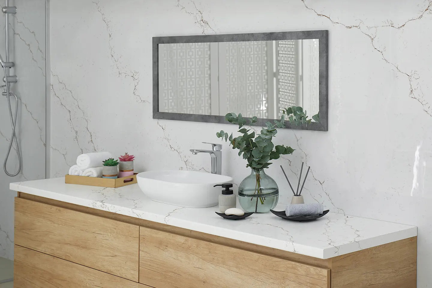 Doğal kuvars minerallerinden üretilir. Gözeneksiz ve pürüzsüz yapısı sayesinde temizlik zahmetini minimuma indirir, günlük kullanımda rahatlık sağlar.