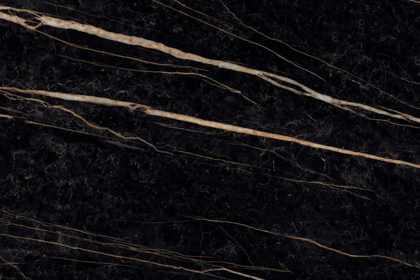 Sahara Noir içeriğinde üst bir sınıf ağırlığı barındırıyor. Koyu kahverengi yüzey, rustik görünümünü kalın ve ön plana işlenmiş altın sarısı keskin damarlardan alıyor.
