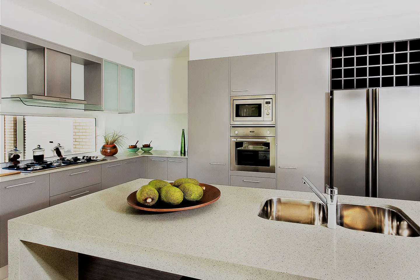 Doğal kuvars minerallerinden üretilir. Gözeneksiz ve pürüzsüz yapısı sayesinde temizlik zahmetini minimuma indirir, günlük kullanımda rahatlık sağlar.